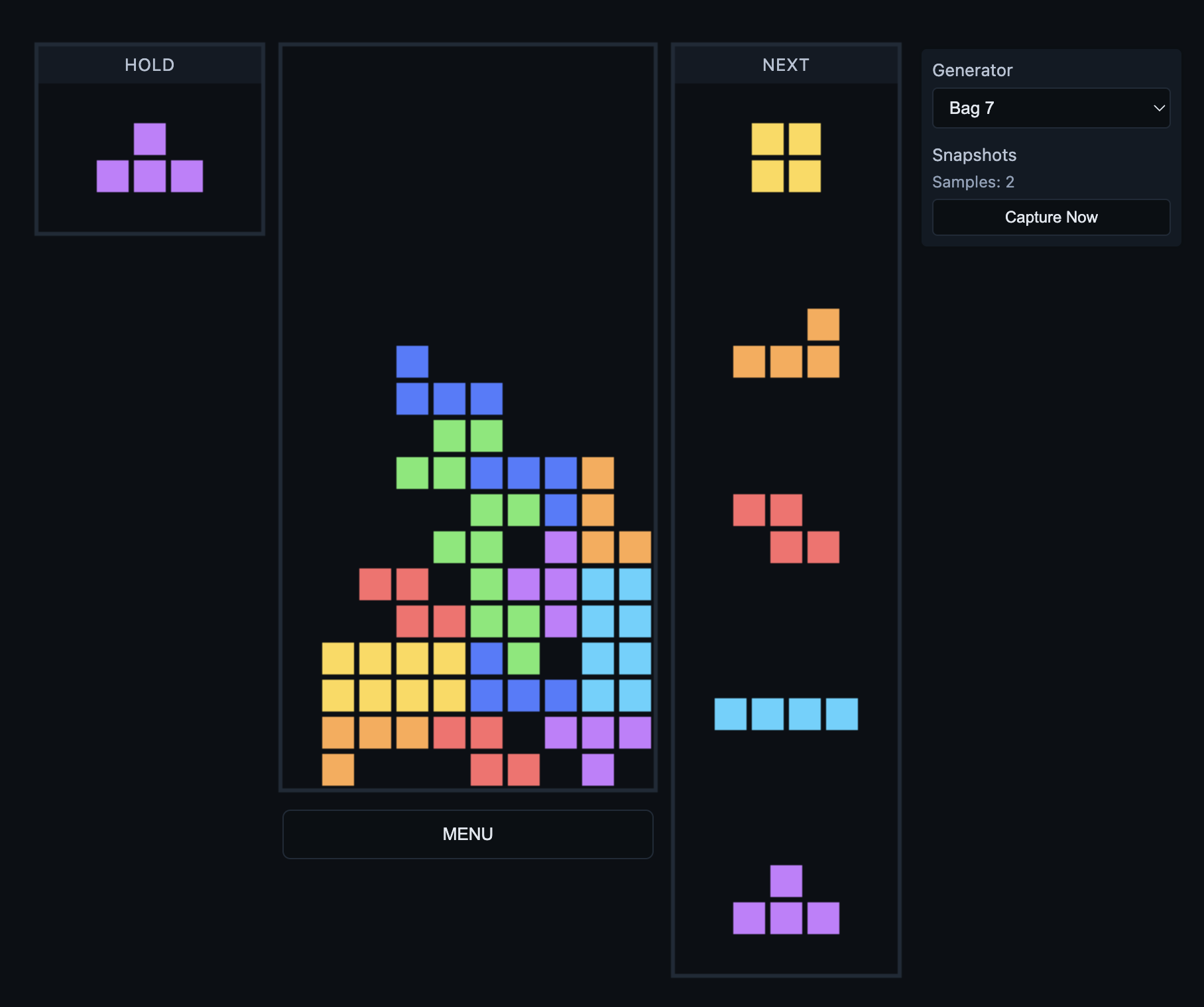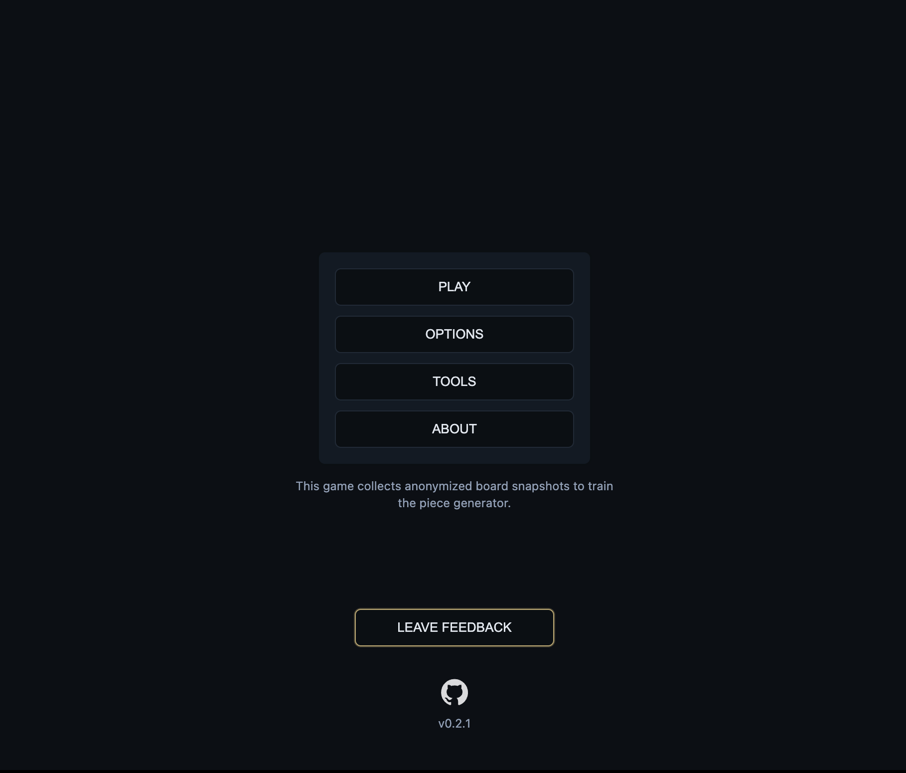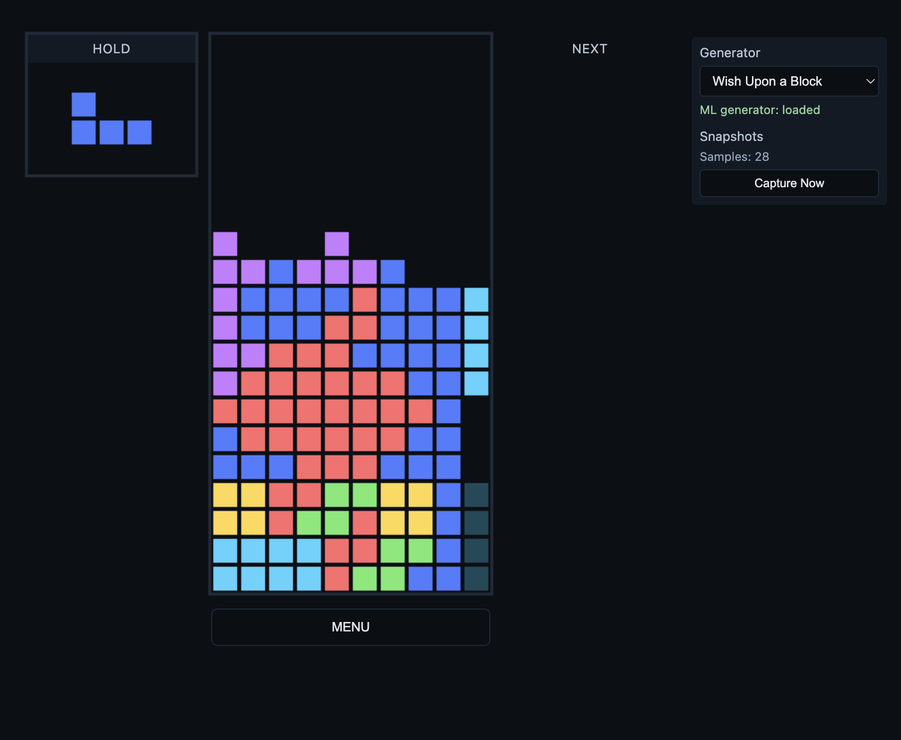 Wish Upon a Block is a lightweight low-latency guideline tetromino game. It is meant to recreate the feeling of "Tetris effect" when every next piece is "just right". Play and try out the ML powered "Wish Upon a Block" piece generator.